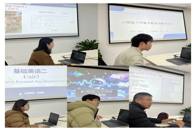 本网讯 为深入落实学校AI能力提升系列培训要求,推动人工智能与教育教学深度融合,12月30日,通识教育与外国语学院在A1N502会议室成功举办人工智能AI应用层(专业知识与能力)培训交流汇报会。副院长(主持工作)罗从文、副院长胡叶婷、副院长黄飞、各教研室主任及AI应用层培训骨干教师等 40余人参会。共同见证跨学科 AI 教学案例成果展示,交流探讨技术融合实践路径。本次AI应用层培训自10月启动以来,采用“4课时线下培训+4课时线下研讨”的模式,遴选全院35%具备AI通用能力基础的骨干教师参与,覆盖英语、数学、物理、体育四大教学领域。培训聚焦“技术落地+场景适配”核心目标,邀请业内专家开展专题讲座与实操指导,引导教师将AI工具融入教学设计、课堂实施、课后反馈全流程,着力破解传统教学中的个性化适配不足、抽象知识难具象化等痛点。交流汇报会上,5位教师代表分享的典型案例亮点纷呈,展现了AI技术在不同学科的创新应用场景:许睿婧老师的《基础英语》课程,通过AI生成多风格教学素材、构建情感词汇场、语音