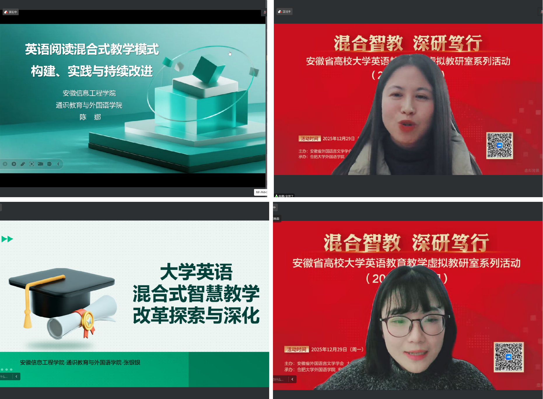 本网讯 12月29日下午,安徽省高校大学英语教育教学虚拟教研室2025年第五期活动于安徽信息工程学院A1N502举行。本次活动以“混合智教、深研笃行”为主题,意在深入探讨人工智能技术在大学英语混合式教学的应用与实践。本次活动由安徽省外国语言文学学会秘书长曹军教授主持并致开幕词。安徽信息工程学院作为承办单位之一,组织全体英语教师线下参加了此次活动。本期虚拟教研室活动分为上下两场,上半场活动由合肥大学外国语学院副院长曹昊主持。他简单开场后,来自合肥大学外国语学院的夏莉老师和欧丽老师分别带来了题为“大学英语线上线下混合式课程教学研究”和“混合式教学模式的构建与实践”的讲座。下半场会议由安徽信息工程学院通识教育与外国语学院副院长胡叶婷主持。(图为领导主持照片)在讲座环节,通识教育与外国语学院英语专业教研室副主任陈娜副教授首先带来了题为“《英语阅读》课程混合式教学模式的构建、实践与持续改进”的讲座。她从英语阅读课程混合式模式的构建、改革和持续改进三个方面展开分享。通过展示具体教学案例,陈娜详细阐释